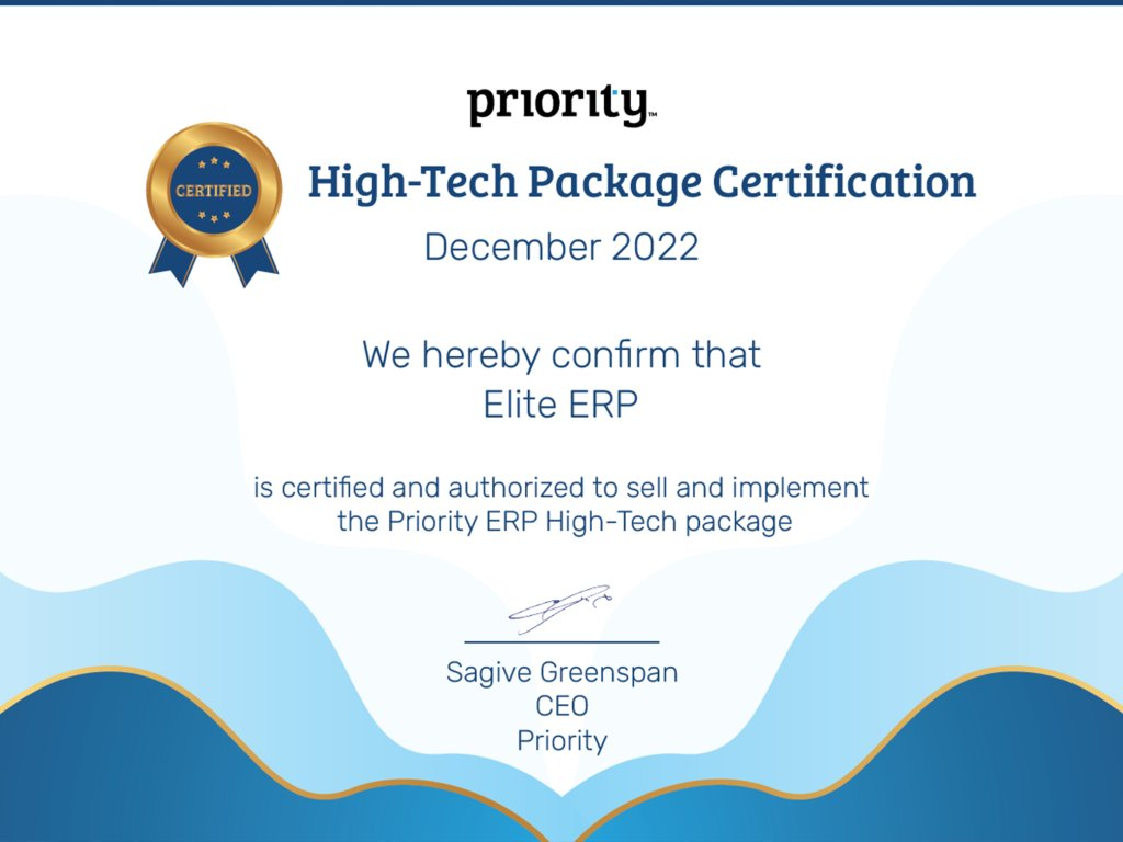 חברת עילית ERP מוסמכת ע"י חברת פריוריטי לשווק וליישם את חבילת ההייטק.